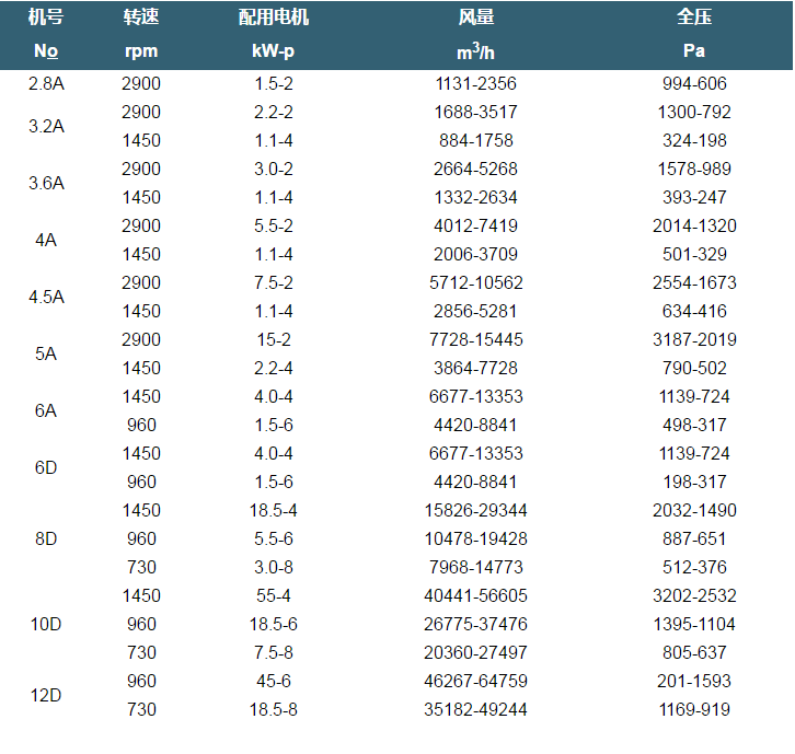 BF4-72型風(fēng)機(jī)的性能與選用件及地基尺寸與4-72型-致,可按其樣本選擇。該風(fēng)機(jī)機(jī)構(gòu)基本與4-72型相同,m.2.8-6采用B35型帶法蘭盤與地腳的電機(jī),0.6-12C、D電動(dòng)機(jī)選用表中與Y系列相對(duì)應(yīng)的YTB系列,安裝形式為B3。